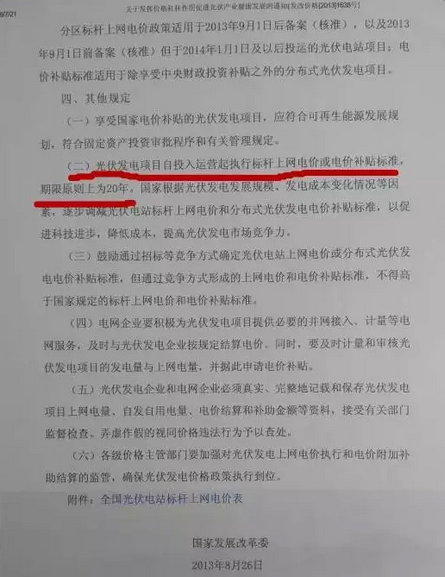 答:《國(guó)家發(fā)展改革委關(guān)于發(fā)揮價(jià)格杠桿作用促進(jìn)光伏產(chǎn)業(yè)健康發(fā)展的通知》中明確表示,補(bǔ)貼由可再生能源發(fā)展基金予以補(bǔ)貼,期限20年。(詳見文件紅線標(biāo)注部分)